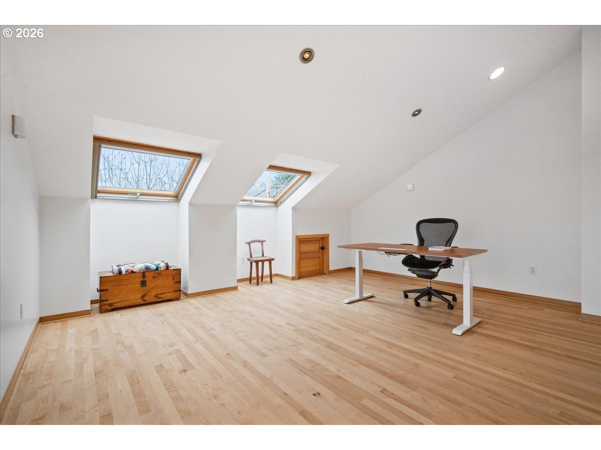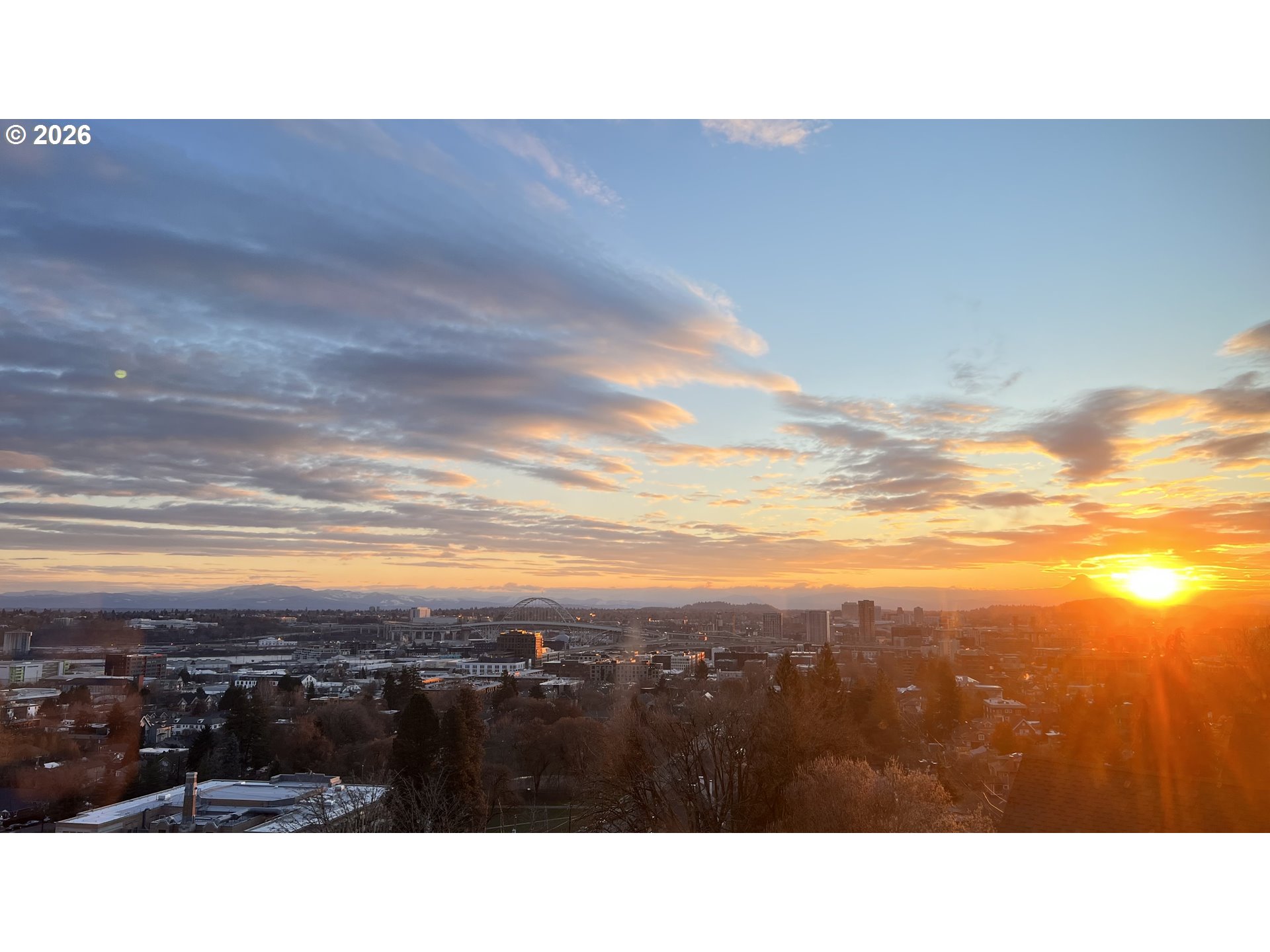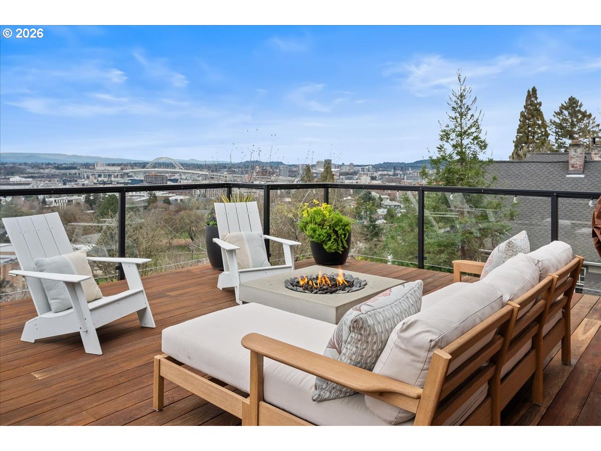 - Kings Heights Contemporary with Sweeping City, River & Four-Mountain Views. Perched above the city in Portlands coveted Kings Heights neighborhood, this striking contemporary home offers nearly 4,000 square feet of light-filled living with panoramic views stretching from the river to four mountain peaks. From almost every level, the horizon unfolds in a sweeping tableau—sky, skyline, and distant mountains shifting beautifully throughout the day.The main level is designed for gathering and easy living in an open-concept floor plan with soaring ceilings & walls of glass. Custom floor-to-ceiling sliding doors open to an expansive view deck, creating a seamless connection between indoors and out. A roomy, feature-filled kitchen will satisfy any home chef. Freshly refinished hardwood floors, a newly painted interior, and a cozy gas fireplace bring warmth and polish to the space.Upstairs, the primary suite is a private retreat in the sky, featuring a radiant floor heated spa bath, generous walk-in closet, and an adjacent office or nursery with French doors opening to a covered, private deck—an ideal perch for morning coffee above the city.The lower level offers exceptional flexibility with a second en suite primary bedroom with private deck access, two additional bedrooms, full bath, laundry, and a spacious rec room with soaring ceilings, wired for A/V and equipped with blackout shades.Thoughtful upgrades include newly painted interior, new wool-blend carpets, gleaming re-finished wood floors, freshly stained decks, zoned HVAC with dual thermostats, a new dual-fuel Lennox furnace and heat pump with S40 smart thermostat, and gas fireplaces in both the living room and upper primary suite. The large, low-maintenance lot supports an easy lock-and-leave lifestyle, complemented by an attached two-car garage with EV charger.This is your Kings Heights penthouse perched above the city!